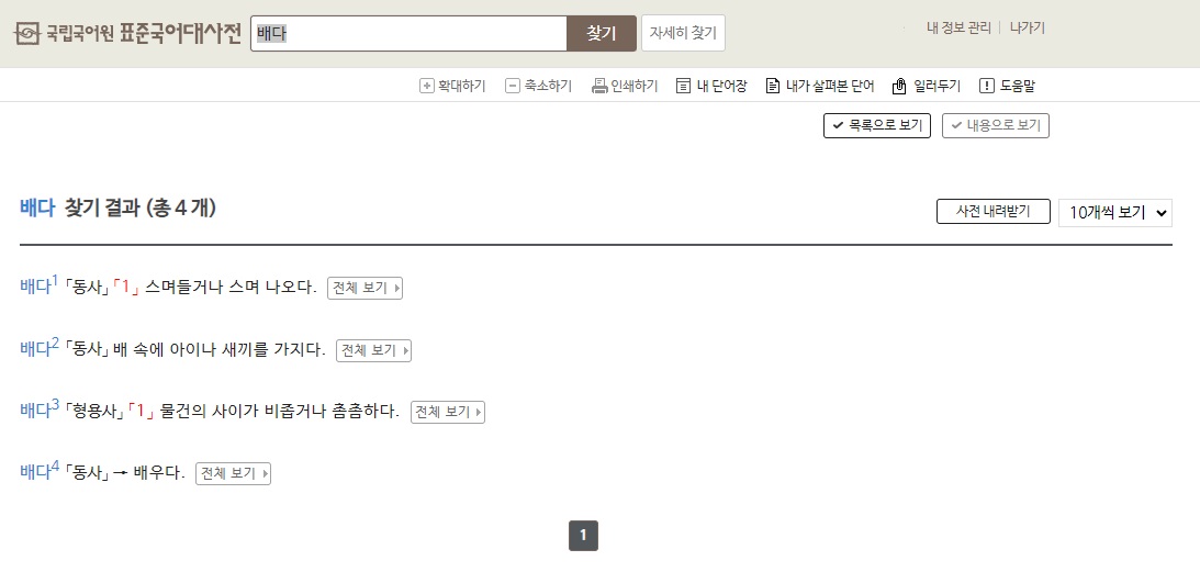 혼동되는 '배개'라는 단어를 확인하기 위해서 '배다'라는 단어의 뜻도 찾아보죠.